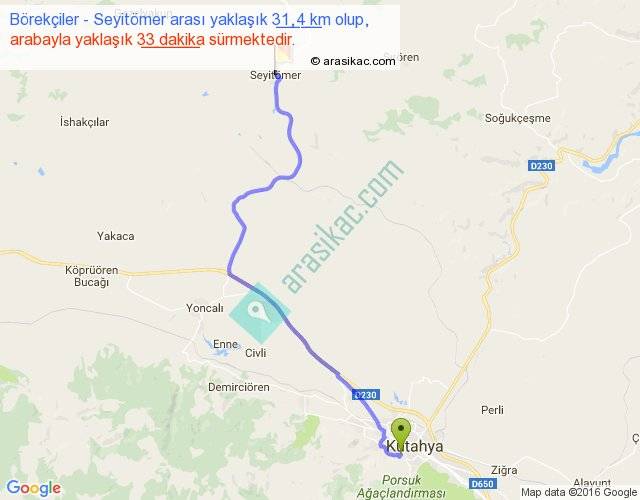 Börekçiler - Seyitömer arası yaklaşık olarak 90 km/h ile yukarıda belirtilen sürede olup, iki yerin kuş uçuşu uzaklığı (mesafesi) 23'dir. Yolculuk otobüsle 42 dakika sürmektedir.
