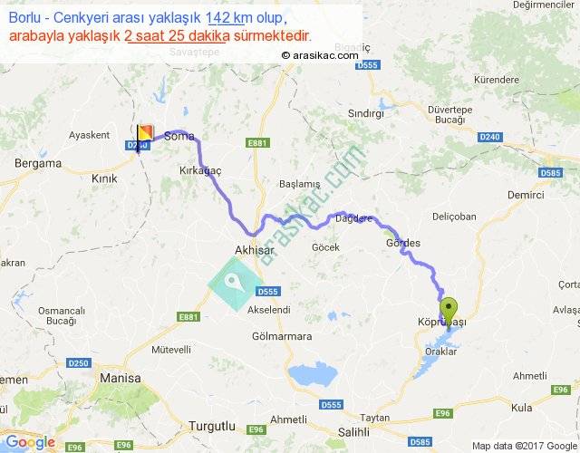 Borlu - Cenkyeri arası yaklaşık olarak 90 km/h ile yukarıda belirtilen sürede olup, iki yerin kuş uçuşu uzaklığı (mesafesi) 93'dir. Yolculuk otobüsle 3 saat 8 dakika sürmektedir.