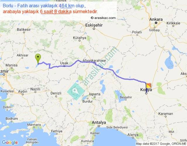Borlu - Fatih arası yaklaşık olarak 90 km/h ile yukarıda belirtilen sürede olup, iki yerin kuş uçuşu uzaklığı (mesafesi) 365'dir. Eğer belirtilen yerler arasında uçak seferi var ise bu süre uçakla 33 dakika'ya kadar düşebilir. Yolculuk otobüsle 7 saat 58 dakika sürmektedir.