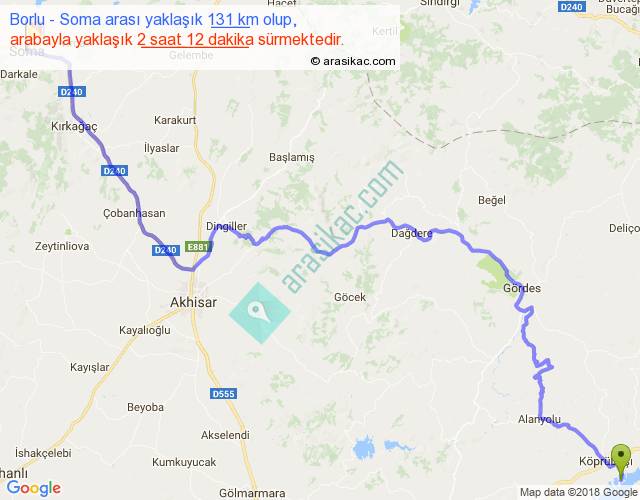 Borlu - Soma arası yaklaşık olarak 90 km/h ile yukarıda belirtilen sürede olup, iki yerin kuş uçuşu uzaklığı (mesafesi) 86'dir. Yolculuk otobüsle 2 saat 51 dakika sürmektedir.