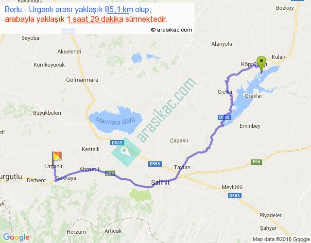 Borlu - Urganlı arası yaklaşık olarak 90 km/h ile yukarıda belirtilen sürede olup, iki yerin kuş uçuşu uzaklığı (mesafesi) 56'dir. Yolculuk otobüsle 1 saat 55 dakika sürmektedir.