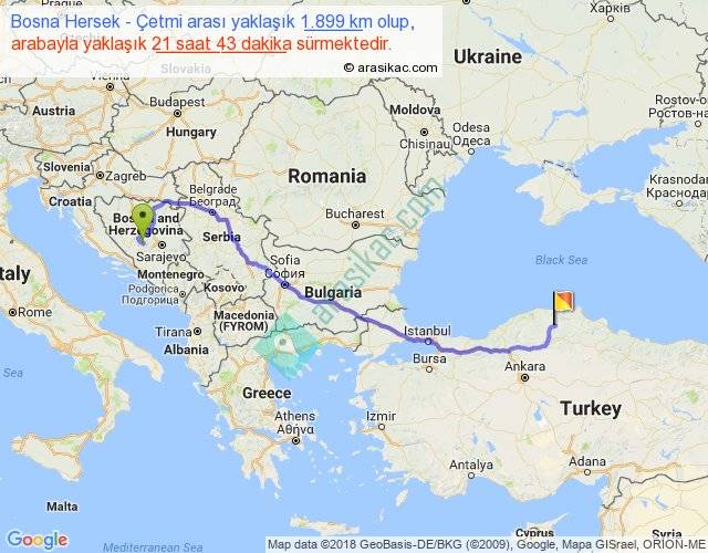 Bosna Hersek - Çetmi arası yaklaşık olarak 90 km/h ile yukarıda belirtilen sürede olup, iki yerin kuş uçuşu uzaklığı (mesafesi) 1354'dir. Eğer belirtilen yerler arasında uçak seferi var ise bu süre uçakla 2 saat 04 dakika'ya kadar düşebilir. Yolculuk otobüsle 1 gün 4 saat sürmektedir.