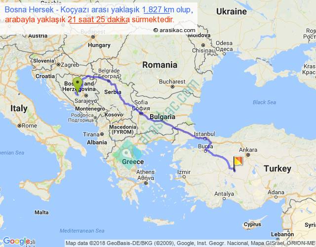 Bosna Hersek - Koçyazı arası yaklaşık olarak 90 km/h ile yukarıda belirtilen sürede olup, iki yerin kuş uçuşu uzaklığı (mesafesi) 1286'dir. Eğer belirtilen yerler arasında uçak seferi var ise bu süre uçakla 1 saat 58 dakika'ya kadar düşebilir. Yolculuk otobüsle 1 gün 3 saat sürmektedir.