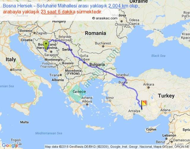 Bosna Hersek - Sofuhane Mahallesi arası yaklaşık olarak 90 km/h ile yukarıda belirtilen sürede olup, iki yerin kuş uçuşu uzaklığı (mesafesi) 1385'dir. Eğer belirtilen yerler arasında uçak seferi var ise bu süre uçakla 2 saat 07 dakika'ya kadar düşebilir. Yolculuk otobüsle 1 gün 6 saat sürmektedir.