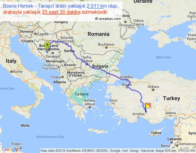 Bosna Hersek - Taraşcı arası yaklaşık olarak 90 km/h ile yukarıda belirtilen sürede olup, iki yerin kuş uçuşu uzaklığı (mesafesi) 1378'dir. Eğer belirtilen yerler arasında uçak seferi var ise bu süre uçakla 2 saat 07 dakika'ya kadar düşebilir. Yolculuk otobüsle 1 gün 6 saat sürmektedir.