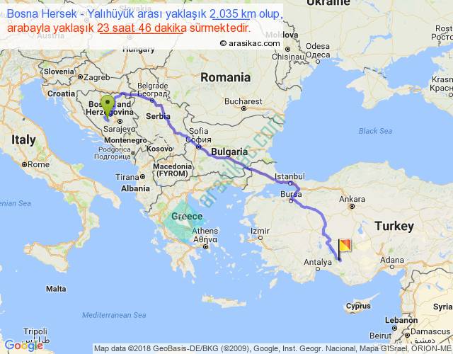 Bosna Hersek - Yalıhüyük arası yaklaşık olarak 90 km/h ile yukarıda belirtilen sürede olup, iki yerin kuş uçuşu uzaklığı (mesafesi) 1410'dir. Eğer belirtilen yerler arasında uçak seferi var ise bu süre uçakla 2 saat 10 dakika'ya kadar düşebilir. Yolculuk otobüsle 1 gün 6 saat sürmektedir.