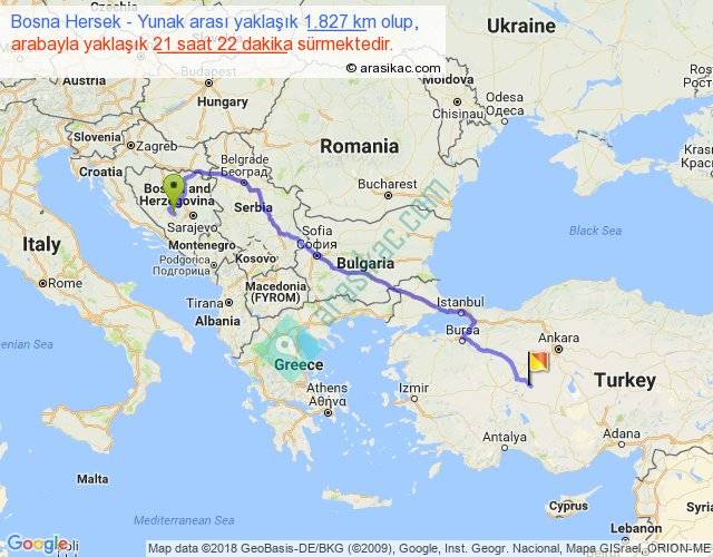 Bosna Hersek - Yunak arası yaklaşık olarak 90 km/h ile yukarıda belirtilen sürede olup, iki yerin kuş uçuşu uzaklığı (mesafesi) 1293'dir. Eğer belirtilen yerler arasında uçak seferi var ise bu süre uçakla 1 saat 59 dakika'ya kadar düşebilir. Yolculuk otobüsle 1 gün 3 saat sürmektedir.