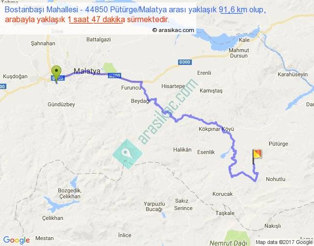 Bostanbaşı Mahallesi - 44850 Pütürge Malatya arası yaklaşık olarak 90 km/h ile yukarıda belirtilen sürede olup, iki yerin kuş uçuşu uzaklığı (mesafesi) 52'dir. Yolculuk otobüsle 2 saat 19 dakika sürmektedir.