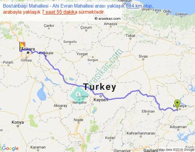 Bostanbaşı Mahallesi - Ahi Evran Mahallesi arası yaklaşık olarak 90 km/h ile yukarıda belirtilen sürede olup, iki yerin kuş uçuşu uzaklığı (mesafesi) 519'dir. Eğer belirtilen yerler arasında uçak seferi var ise bu süre uçakla 47 dakika'ya kadar düşebilir. Yolculuk otobüsle 10 saat 17 dakika sürmektedir.