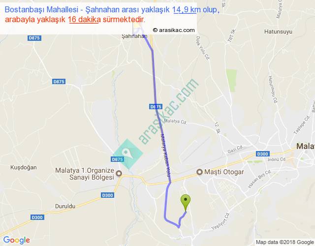 Bostanbaşı Mahallesi - Şahnahan arası yaklaşık olarak 90 km/h ile yukarıda belirtilen sürede olup, iki yerin kuş uçuşu uzaklığı (mesafesi) 11'dir. Yolculuk otobüsle 20 dakika sürmektedir.