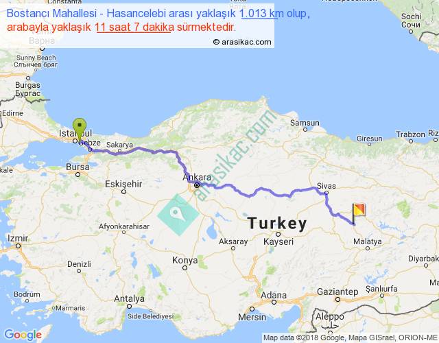 Bostancı Mahallesi - Hasancelebi arası yaklaşık olarak 90 km/h ile yukarıda belirtilen sürede olup, iki yerin kuş uçuşu uzaklığı (mesafesi) 778'dir. Eğer belirtilen yerler arasında uçak seferi var ise bu süre uçakla 1 saat 11 dakika'ya kadar düşebilir. Yolculuk otobüsle 14 saat 27 dakika sürmektedir.