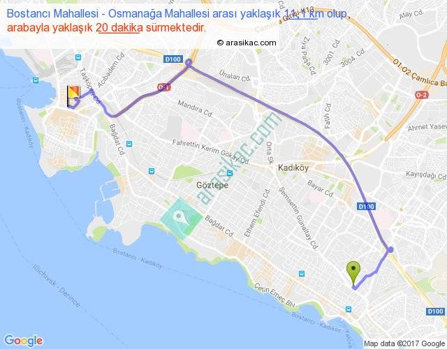 Bostancı Mahallesi - Osmanağa Mahallesi arası yaklaşık olarak 90 km/h ile yukarıda belirtilen sürede olup, iki yerin kuş uçuşu uzaklığı (mesafesi) 7'dir. Yolculuk otobüsle 26 dakika sürmektedir.