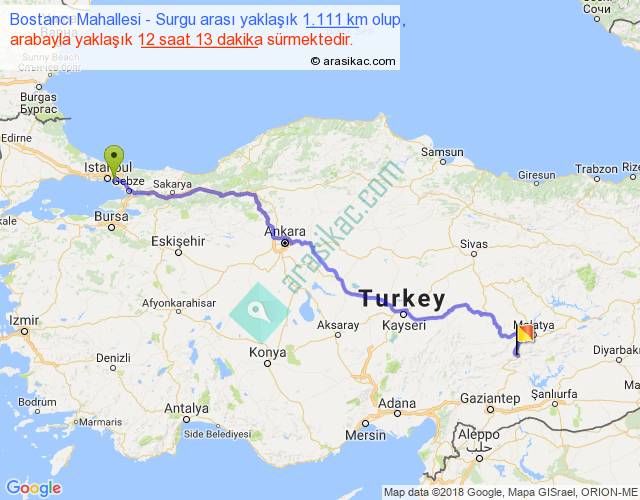 Bostancı Mahallesi - Surgu arası yaklaşık olarak 90 km/h ile yukarıda belirtilen sürede olup, iki yerin kuş uçuşu uzaklığı (mesafesi) 824'dir. Eğer belirtilen yerler arasında uçak seferi var ise bu süre uçakla 1 saat 16 dakika'ya kadar düşebilir. Yolculuk otobüsle 15 saat 52 dakika sürmektedir.