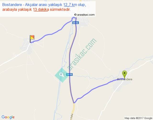 Bostandere - Akçalar arası yaklaşık olarak 90 km/h ile yukarıda belirtilen sürede olup, iki yerin kuş uçuşu uzaklığı (mesafesi) 6'dir. Yolculuk otobüsle 16 dakika sürmektedir.