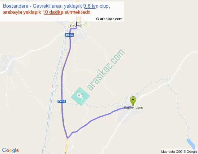 Bostandere - Gevrekli arası yaklaşık olarak 90 km/h ile yukarıda belirtilen sürede olup, iki yerin kuş uçuşu uzaklığı (mesafesi) 5'dir. Yolculuk otobüsle 13 dakika sürmektedir.