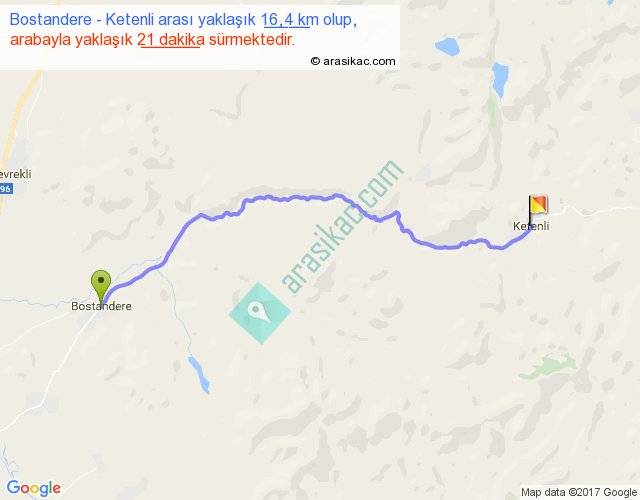 Bostandere - Ketenli arası yaklaşık olarak 90 km/h ile yukarıda belirtilen sürede olup, iki yerin kuş uçuşu uzaklığı (mesafesi) 13'dir. Yolculuk otobüsle 27 dakika sürmektedir.