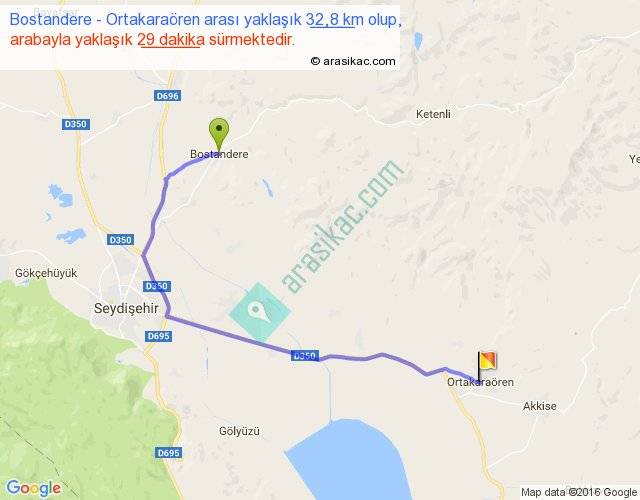 Bostandere - Ortakaraören arası yaklaşık olarak 90 km/h ile yukarıda belirtilen sürede olup, iki yerin kuş uçuşu uzaklığı (mesafesi) 21'dir. Yolculuk otobüsle 37 dakika sürmektedir.