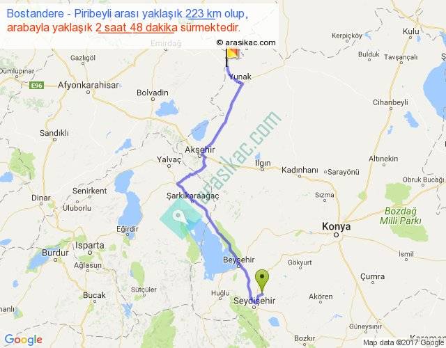 Bostandere - Piribeyli arası yaklaşık olarak 90 km/h ile yukarıda belirtilen sürede olup, iki yerin kuş uçuşu uzaklığı (mesafesi) 158'dir. Yolculuk otobüsle 3 saat 38 dakika sürmektedir.