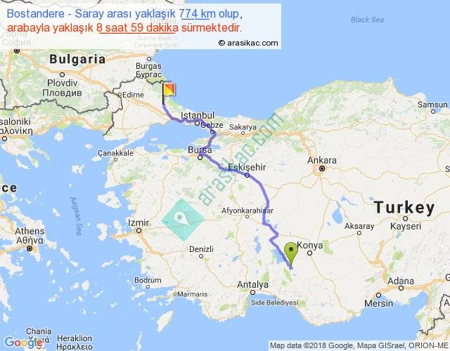 Bostandere - Saray arası yaklaşık olarak 90 km/h ile yukarıda belirtilen sürede olup, iki yerin kuş uçuşu uzaklığı (mesafesi) 553'dir. Eğer belirtilen yerler arasında uçak seferi var ise bu süre uçakla 51 dakika'ya kadar düşebilir. Yolculuk otobüsle 11 saat 40 dakika sürmektedir.