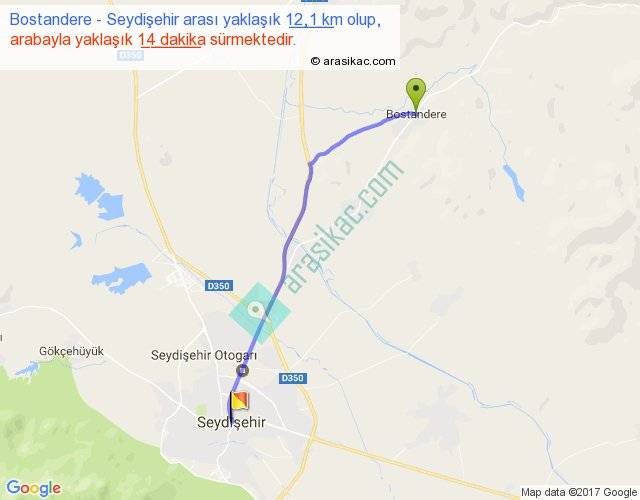 Bostandere - Seydişehir arası yaklaşık olarak 90 km/h ile yukarıda belirtilen sürede olup, iki yerin kuş uçuşu uzaklığı (mesafesi) 11'dir. Yolculuk otobüsle 18 dakika sürmektedir.