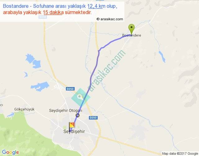 Bostandere - Sofuhane arası yaklaşık olarak 90 km/h ile yukarıda belirtilen sürede olup, iki yerin kuş uçuşu uzaklığı (mesafesi) 11'dir. Yolculuk otobüsle 19 dakika sürmektedir.
