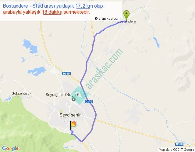 Bostandere - Stad arası yaklaşık olarak 90 km/h ile yukarıda belirtilen sürede olup, iki yerin kuş uçuşu uzaklığı (mesafesi) 12'dir. Yolculuk otobüsle 23 dakika sürmektedir.