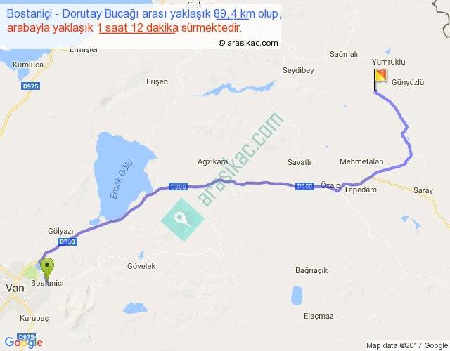 Bostaniçi - Dorutay Bucağı arası yaklaşık olarak 90 km/h ile yukarıda belirtilen sürede olup, iki yerin kuş uçuşu uzaklığı (mesafesi) 64'dir. Yolculuk otobüsle 1 saat 33 dakika sürmektedir.