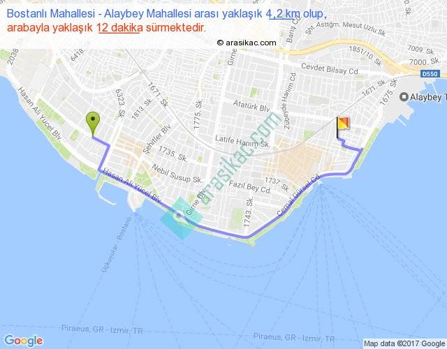 Bostanlı Mahallesi - Alaybey Mahallesi arası yaklaşık olarak 90 km/h ile yukarıda belirtilen sürede olup, iki yerin kuş uçuşu uzaklığı (mesafesi) 3'dir. Yolculuk otobüsle 15 dakika sürmektedir.