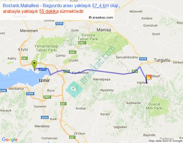 Bostanlı Mahallesi - Bagyurdu arası yaklaşık olarak 90 km/h ile yukarıda belirtilen sürede olup, iki yerin kuş uçuşu uzaklığı (mesafesi) 47'dir. Yolculuk otobüsle 1 saat 11 dakika sürmektedir.