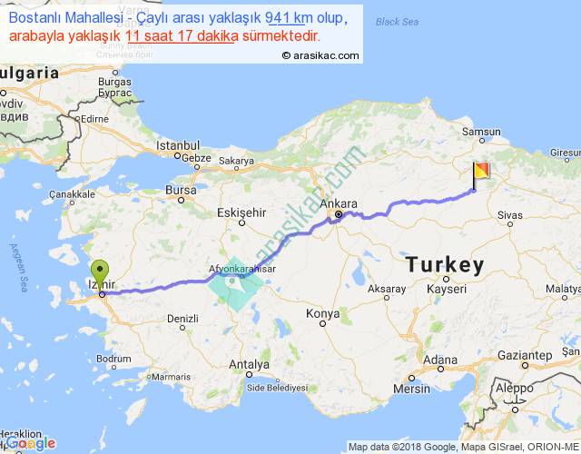 Bostanlı Mahallesi - Çaylı arası yaklaşık olarak 90 km/h ile yukarıda belirtilen sürede olup, iki yerin kuş uçuşu uzaklığı (mesafesi) 802'dir. Eğer belirtilen yerler arasında uçak seferi var ise bu süre uçakla 1 saat 14 dakika'ya kadar düşebilir. Yolculuk otobüsle 14 saat 40 dakika sürmektedir.