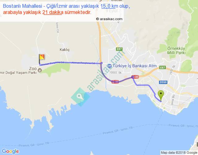 Bostanlı Mahallesi - Çiğli İzmir arası yaklaşık olarak 90 km/h ile yukarıda belirtilen sürede olup, iki yerin kuş uçuşu uzaklığı (mesafesi) 12'dir. Yolculuk otobüsle 27 dakika sürmektedir.