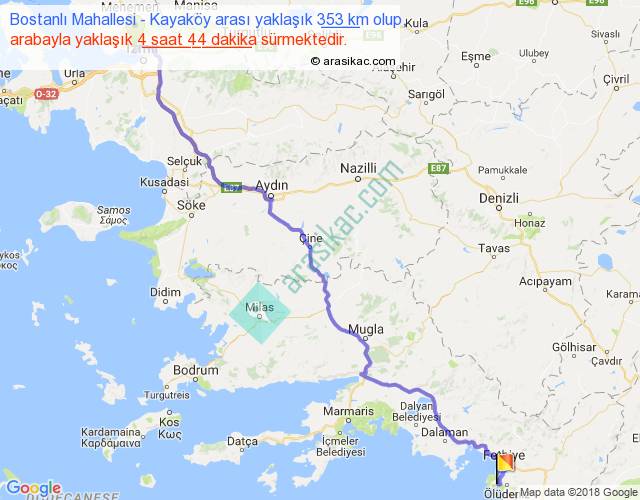Bostanlı Mahallesi - Kayaköy arası yaklaşık olarak 90 km/h ile yukarıda belirtilen sürede olup, iki yerin kuş uçuşu uzaklığı (mesafesi) 272'dir. Eğer belirtilen yerler arasında uçak seferi var ise bu süre uçakla 25 dakika'ya kadar düşebilir. Yolculuk otobüsle 6 saat 9 dakika sürmektedir.