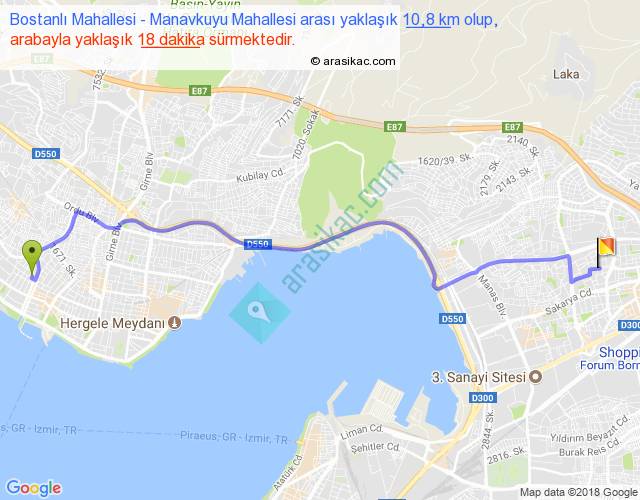 Bostanlı Mahallesi - Manavkuyu Mahallesi arası yaklaşık olarak 90 km/h ile yukarıda belirtilen sürede olup, iki yerin kuş uçuşu uzaklığı (mesafesi) 8'dir. Yolculuk otobüsle 23 dakika sürmektedir.