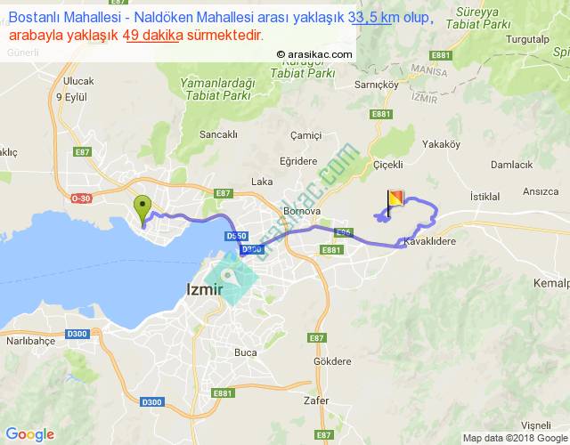 Bostanlı Mahallesi - Naldöken Mahallesi arası yaklaşık olarak 90 km/h ile yukarıda belirtilen sürede olup, iki yerin kuş uçuşu uzaklığı (mesafesi) 16'dir. Yolculuk otobüsle 1 saat 3 dakika sürmektedir.