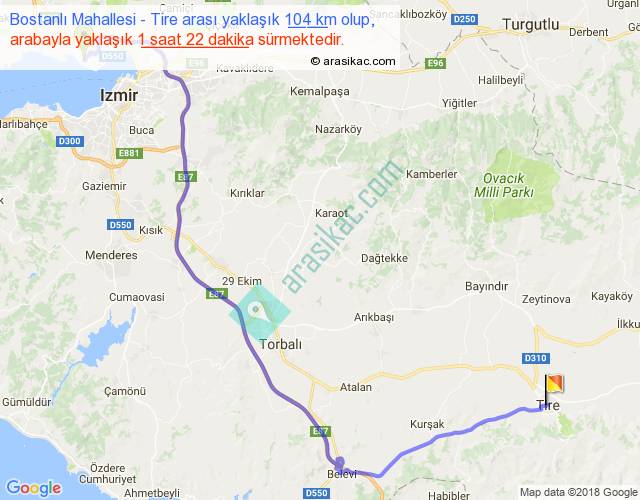 Bostanlı Mahallesi - Tire arası yaklaşık olarak 90 km/h ile yukarıda belirtilen sürede olup, iki yerin kuş uçuşu uzaklığı (mesafesi) 69'dir. Yolculuk otobüsle 1 saat 46 dakika sürmektedir.