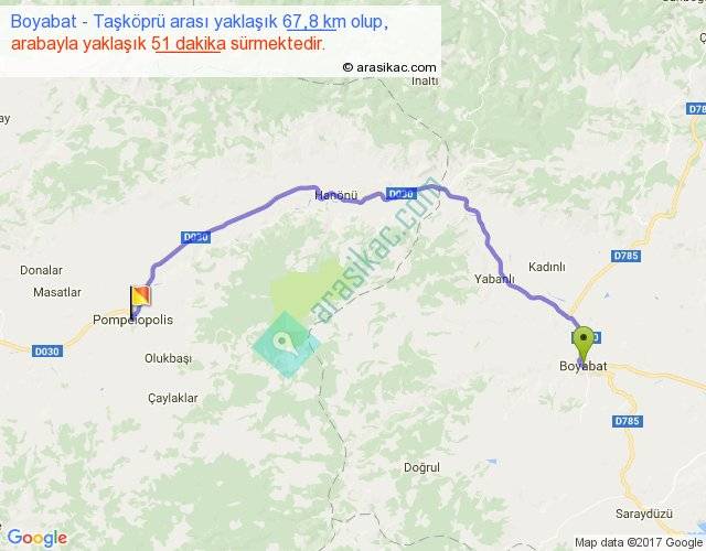 Boyabat - Taşköprü arası yaklaşık olarak 90 km/h ile yukarıda belirtilen sürede olup, iki yerin kuş uçuşu uzaklığı (mesafesi) 47'dir. Yolculuk otobüsle 1 saat 6 dakika sürmektedir.