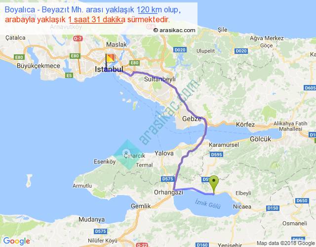 Boyalıca - Beyazıt Mh. arası yaklaşık olarak 90 km/h ile yukarıda belirtilen sürede olup, iki yerin kuş uçuşu uzaklığı (mesafesi) 77'dir. Yolculuk otobüsle 1 saat 58 dakika sürmektedir.