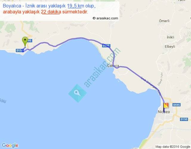 Boyalıca - İznik arası yaklaşık olarak 90 km/h ile yukarıda belirtilen sürede olup, iki yerin kuş uçuşu uzaklığı (mesafesi) 15'dir. Yolculuk otobüsle 28 dakika sürmektedir.