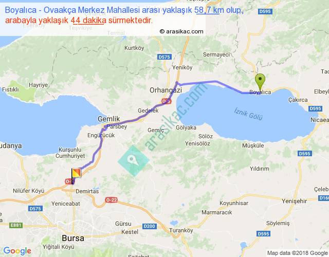 Boyalıca - Ovaakça Merkez Mahallesi arası yaklaşık olarak 90 km/h ile yukarıda belirtilen sürede olup, iki yerin kuş uçuşu uzaklığı (mesafesi) 47'dir. Yolculuk otobüsle 57 dakika sürmektedir.