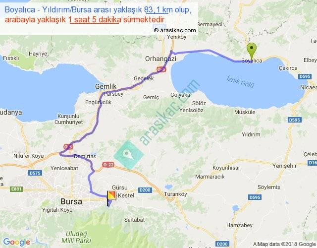 Boyalıca - Yıldırım Bursa arası yaklaşık olarak 90 km/h ile yukarıda belirtilen sürede olup, iki yerin kuş uçuşu uzaklığı (mesafesi) 48'dir. Yolculuk otobüsle 1 saat 24 dakika sürmektedir.