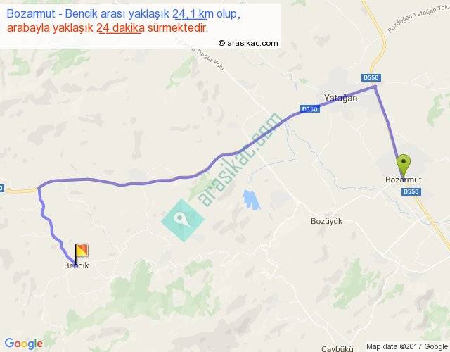 Bozarmut - Bencik arası yaklaşık olarak 90 km/h ile yukarıda belirtilen sürede olup, iki yerin kuş uçuşu uzaklığı (mesafesi) 15'dir. Yolculuk otobüsle 31 dakika sürmektedir.