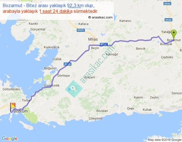 Bozarmut - Bitez arası yaklaşık olarak 90 km/h ile yukarıda belirtilen sürede olup, iki yerin kuş uçuşu uzaklığı (mesafesi) 76'dir. Yolculuk otobüsle 1 saat 49 dakika sürmektedir.