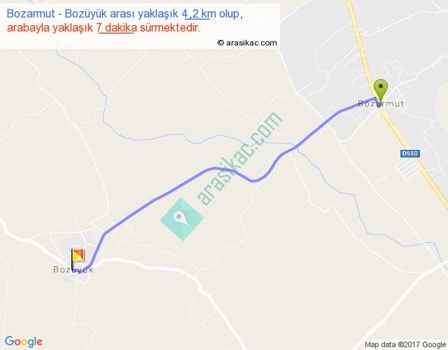 Bozarmut - Bozüyük arası yaklaşık olarak 90 km/h ile yukarıda belirtilen sürede olup, iki yerin kuş uçuşu uzaklığı (mesafesi) 4'dir. Yolculuk otobüsle 9 dakika sürmektedir.