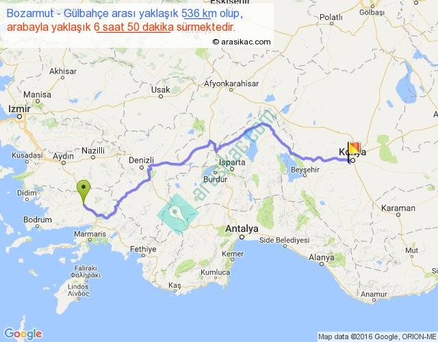 Bozarmut - Gülbahçe arası yaklaşık olarak 90 km/h ile yukarıda belirtilen sürede olup, iki yerin kuş uçuşu uzaklığı (mesafesi) 378'dir. Eğer belirtilen yerler arasında uçak seferi var ise bu süre uçakla 34 dakika'ya kadar düşebilir. Yolculuk otobüsle 8 saat 53 dakika sürmektedir.