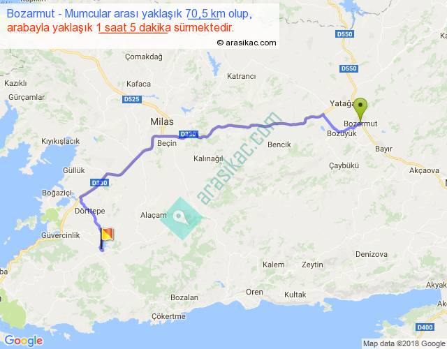 Bozarmut - Mumcular arası yaklaşık olarak 90 km/h ile yukarıda belirtilen sürede olup, iki yerin kuş uçuşu uzaklığı (mesafesi) 50'dir. Yolculuk otobüsle 1 saat 24 dakika sürmektedir.