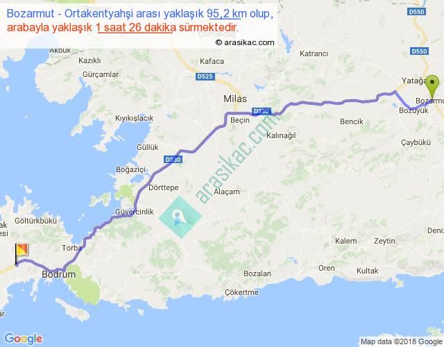 Bozarmut - Ortakentyahşi arası yaklaşık olarak 90 km/h ile yukarıda belirtilen sürede olup, iki yerin kuş uçuşu uzaklığı (mesafesi) 78'dir. Yolculuk otobüsle 1 saat 51 dakika sürmektedir.