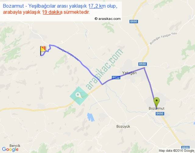 Bozarmut - Yeşilbağcılar arası yaklaşık olarak 90 km/h ile yukarıda belirtilen sürede olup, iki yerin kuş uçuşu uzaklığı (mesafesi) 13'dir. Yolculuk otobüsle 24 dakika sürmektedir.