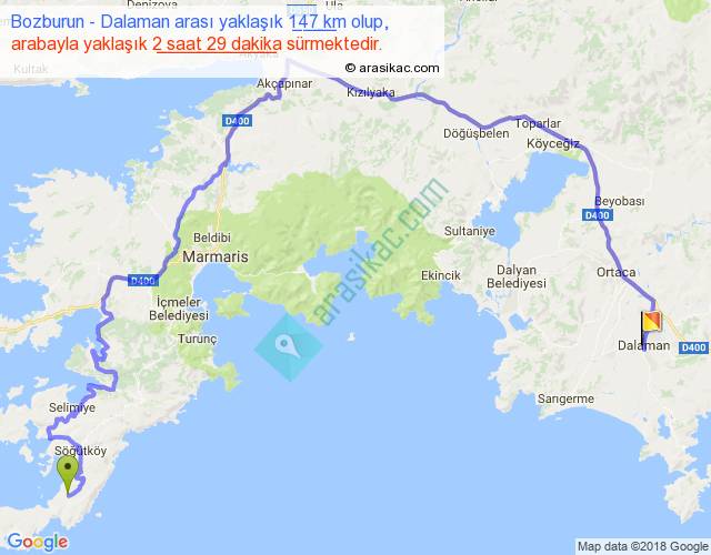 Bozburun - Dalaman arası yaklaşık olarak 90 km/h ile yukarıda belirtilen sürede olup, iki yerin kuş uçuşu uzaklığı (mesafesi) 65'dir. Yolculuk otobüsle 3 saat 13 dakika sürmektedir.