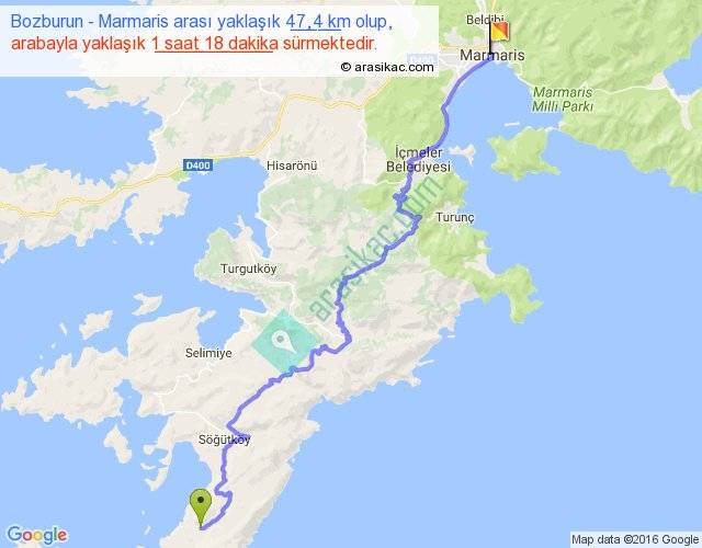 Bozburun - Marmaris arası yaklaşık olarak 90 km/h ile yukarıda belirtilen sürede olup, iki yerin kuş uçuşu uzaklığı (mesafesi) 31'dir. Yolculuk otobüsle 1 saat 41 dakika sürmektedir.