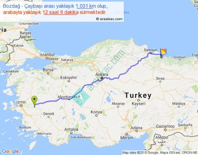 Bozdağ - Çaybaşı arası yaklaşık olarak 90 km/h ile yukarıda belirtilen sürede olup, iki yerin kuş uçuşu uzaklığı (mesafesi) 822'dir. Eğer belirtilen yerler arasında uçak seferi var ise bu süre uçakla 1 saat 15 dakika'ya kadar düşebilir. Yolculuk otobüsle 15 saat 43 dakika sürmektedir.